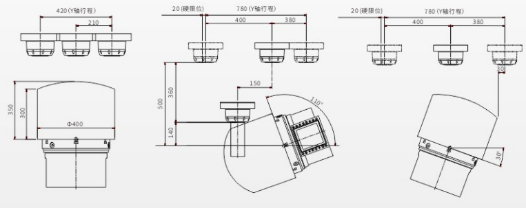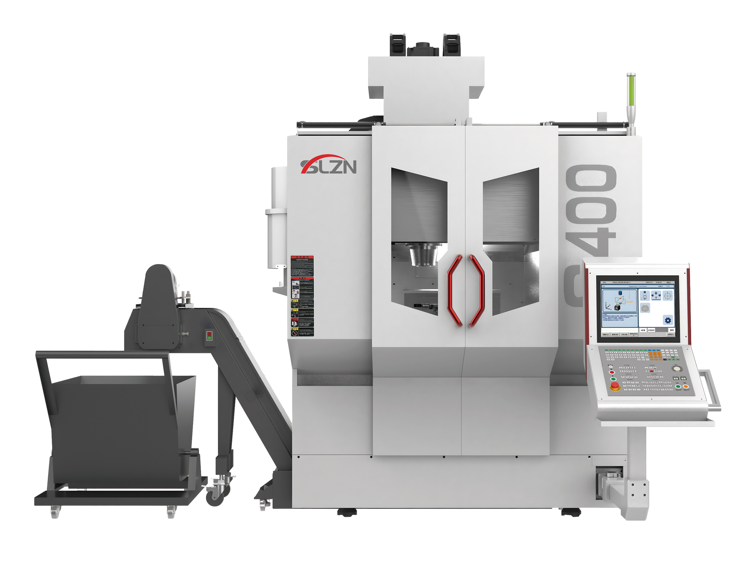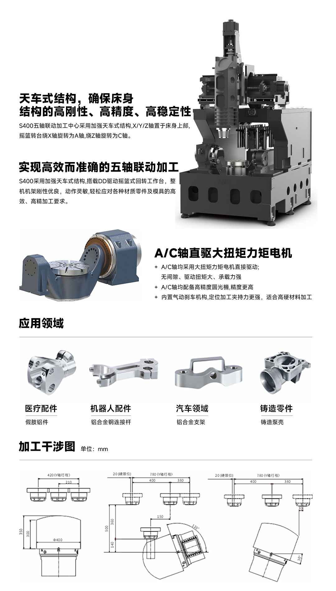 The S400 five-axis machining center adopts a reinforced crane-style structure, with the X/Y/Z axes positioned on the upper part of the bed. The cradle turntable rotates around the X axis as the A axis and around the Z axis as the C axis.