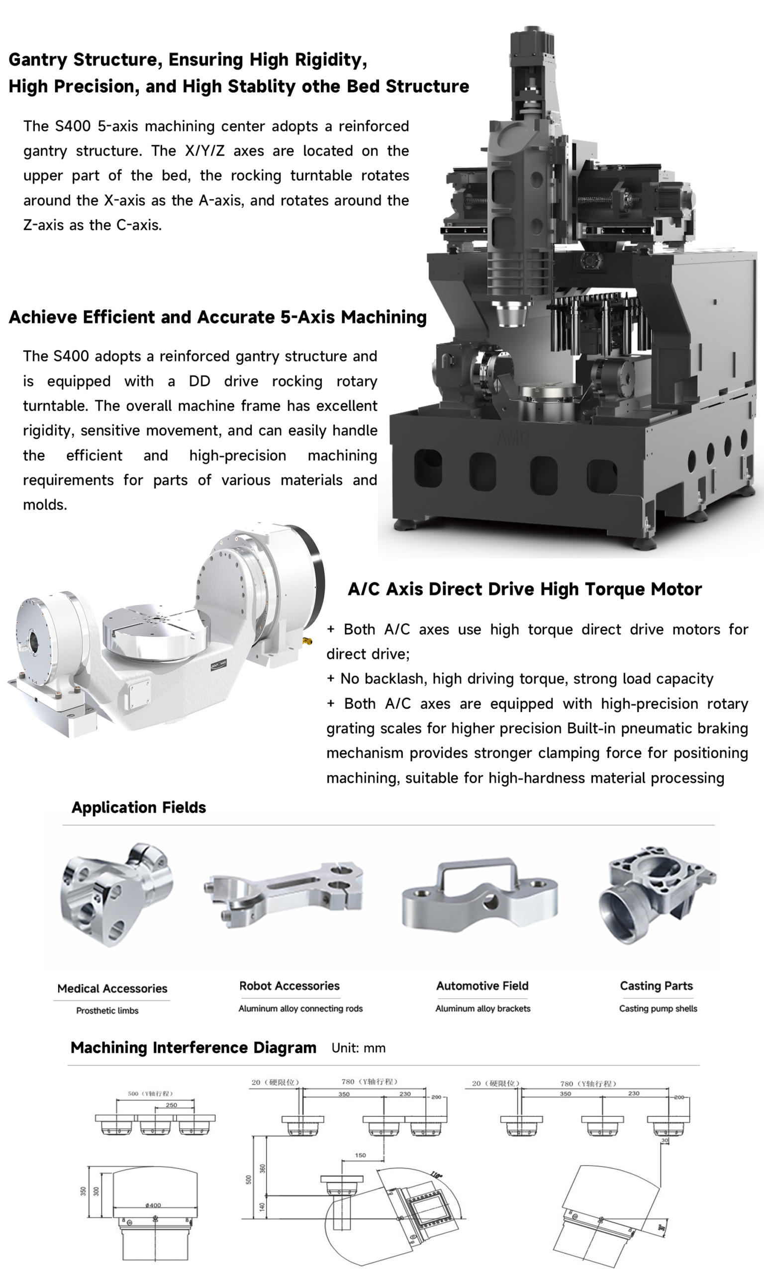 The S400 adopts a reinforced crane-style structure and is equipped with a DD-driven cradle-style rotary table. The entire machine frame is highly rigid and responsive, easily meeting the efficient and high-precision machining requirements for parts and molds of various materials.